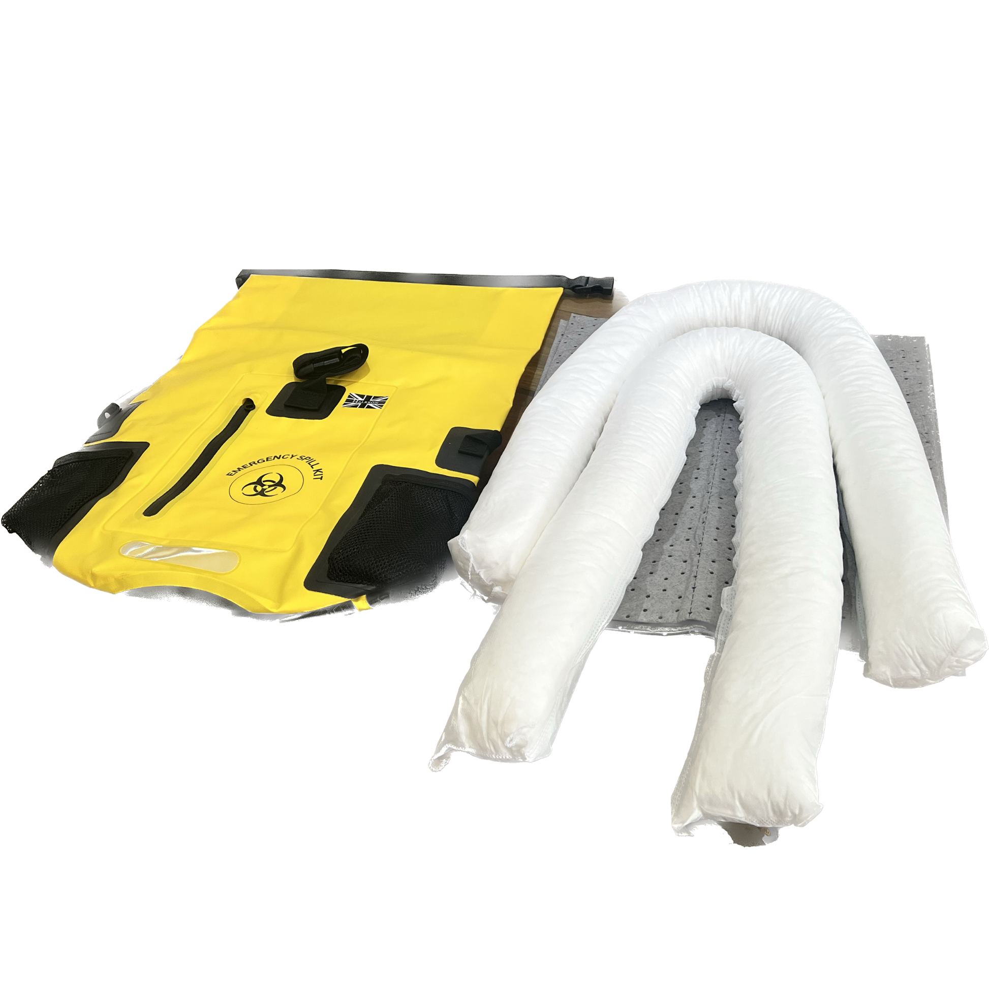 PVC backpack style storage bag with roll top and clipped top. Yellow material with recognisable logo for various items of your emergency spill kit (not included). Bag comes with padded rucksack harness for comfortable carrying on site, as well as zipped internal and front pockets and two mesh side pockets.